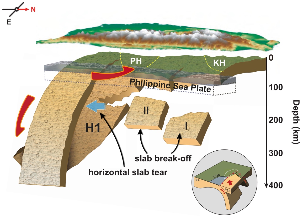 台湾地处欧亚板块和菲律宾海板块强相互作用区域,地震火山活动活跃。在台湾北部,菲律宾海板块沿琉球海沟俯冲到欧亚板块之下,而在台湾南部,欧亚板块沿马尼拉海沟俯冲到菲律宾海板块下方,这一现象称为俯冲极性反转。虽然前人针对台湾地区的深部构造开展了大量研究工作,但由于该地区复杂的构造环境,造成俯冲极性反转的原因至今仍存在很大的争议。该研究基于全球多个地震数据中心公布的地震台网记录到的远近震P波走时数据,利用先进的远近震联合层析成像技术对台湾岛下方进行精细结构成像,揭示出欧亚板块在台湾北部和中部分别发生拆离(slab break-off)和撕裂(slab tear)两种破坏方式,并进一步分析指出强烈的弧陆碰撞和浮力高地的阻挡是造成板块破坏的关键因素,阐明台湾地区俯冲极性反转现象的发生与自北向南发生的板块破坏密切相关,为解释俯冲极性反转机制提供了新的思路。