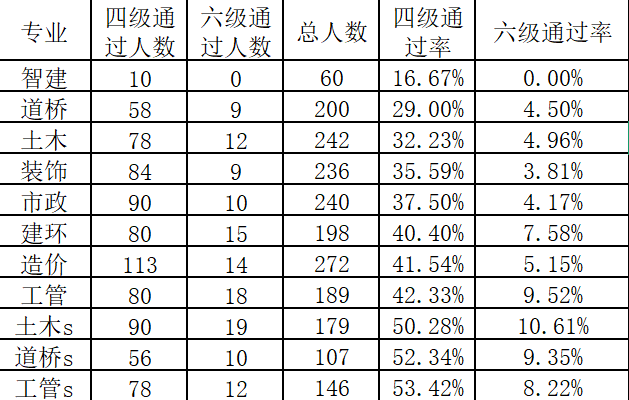 专业 | 四级通过人数 | 六级通过人数 | 总人数 | 四级通过率 | 六级通过率 |