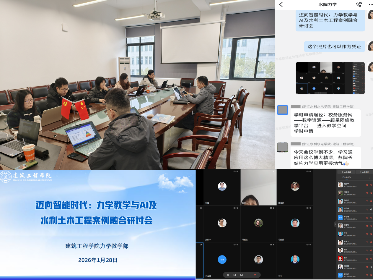 为深化力学类课程教学改革,探索人工智能技术与工程案例在力学教学中的创新融合路径,1月28日上午9时,建筑工程学院力学教学部组织力学课程教学改革研讨会在二训楼B421会议室顺利召开。本次研讨会采取线上线下混合模式,通过浙政钉会议平台同步进行,吸引了来自建工、机械和水利学院共18位教师积极参与。