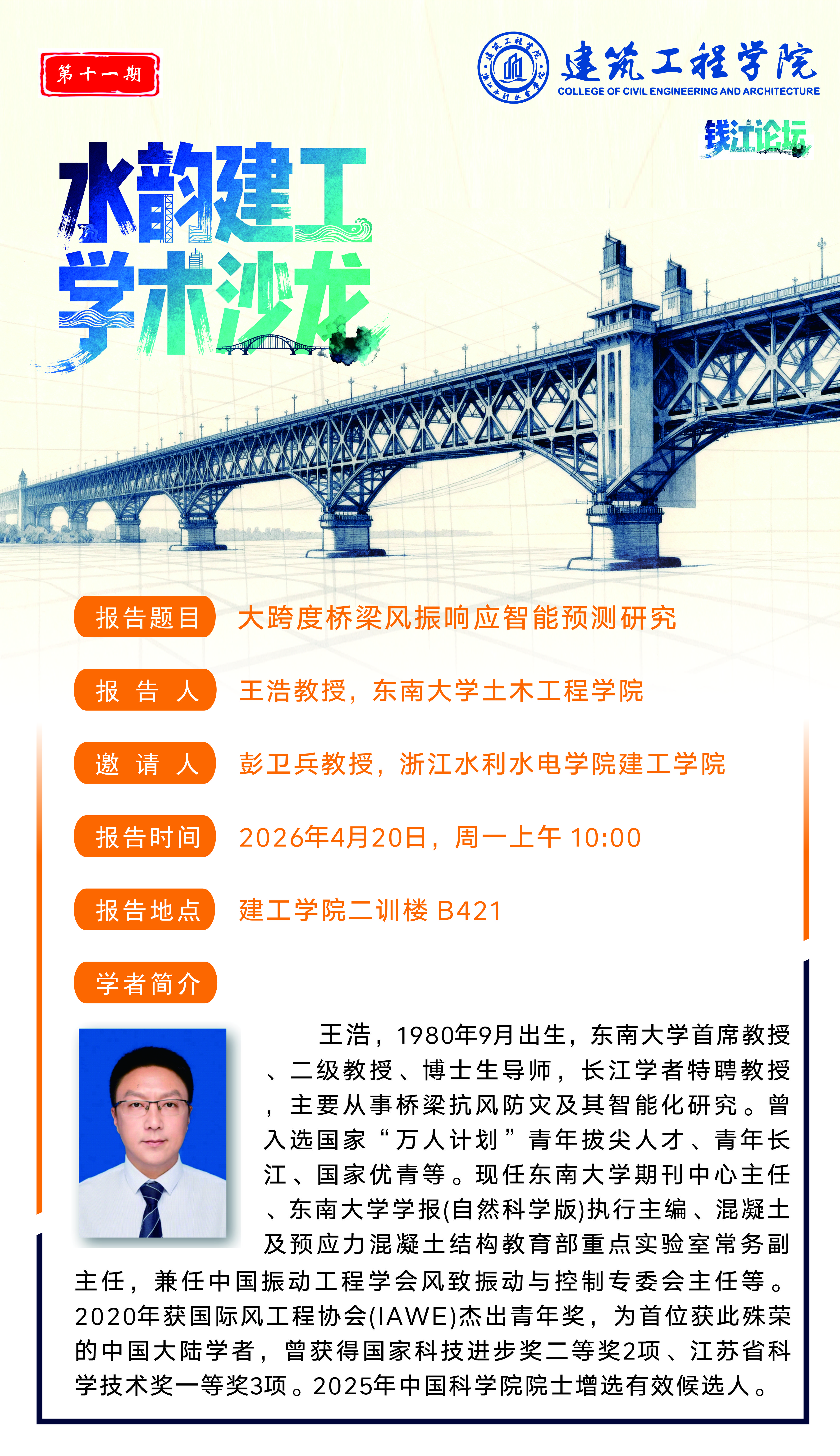 主讲人简介:王浩,1980年9月出生,东南大学首席教授、二级教授、博士生导师,长江学者特聘教授。2025年入选中国科学院院士增选有效候选人。主要从事桥梁抗风防灾及其智能化研究。